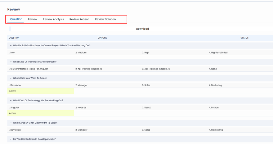 {/* table to display all questions */}