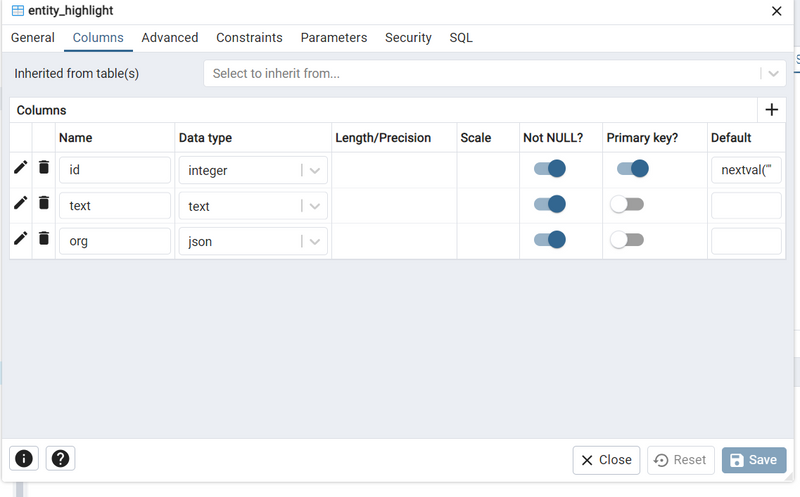 Open the TableIn pgAdmin, expand your database by clicking on it. Navigate to Schemas > Tables. Find and select your table (e.g., entity_highlight). -