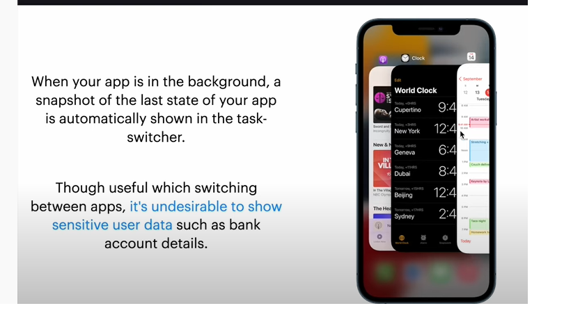 When your app is in the background, a snapshot of the last state of your app is automatically shown in the task-switcher. Though useful which switching between apps, it’s undesirable to show sensitive user data such as bank account details. Seen this feature in action before? Perhaps the picture below will ring a bell —