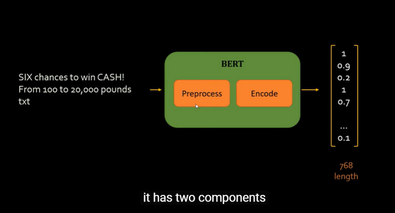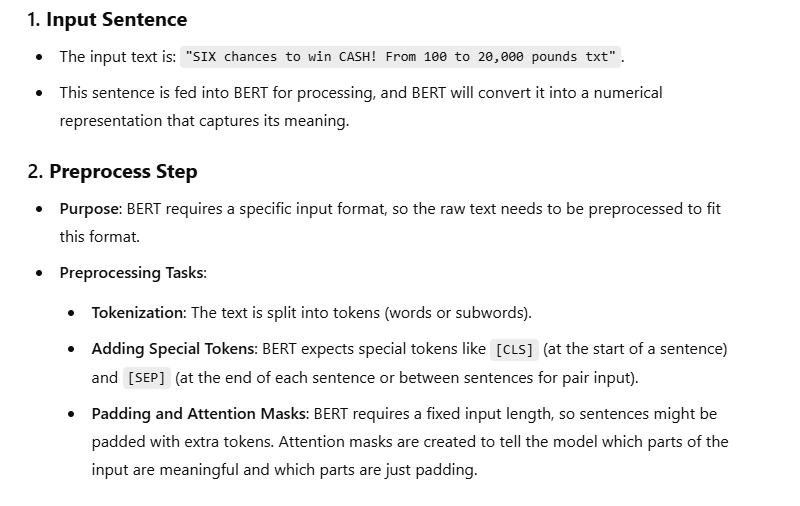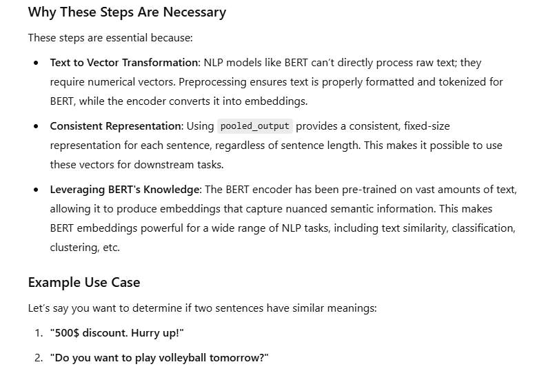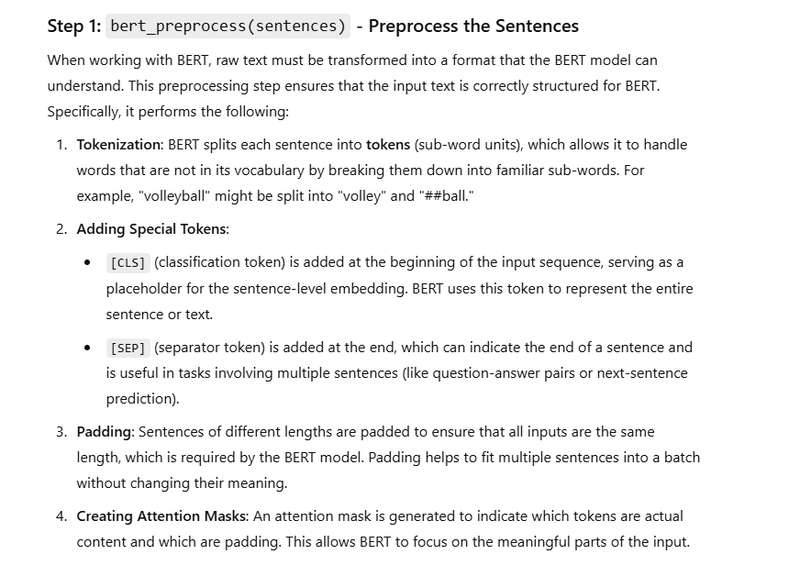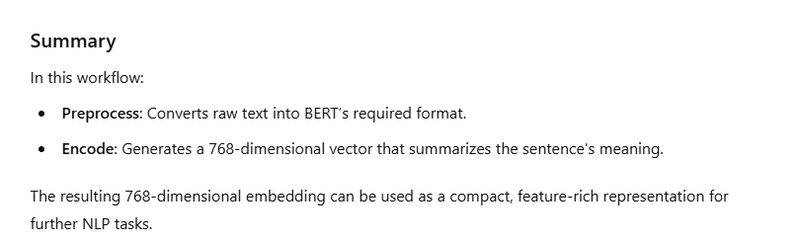 BERT (Bidirectional Encoder Representations from Transformers) works in two main stages—Preprocess and Encode—to generate a sentence embedding. Here’s a breakdown of each component in the diagram