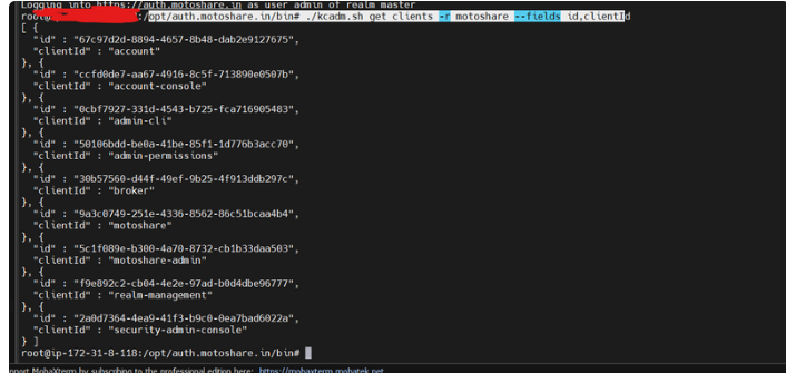 opt/auth.motoshare.in/bin# ./kcadm.sh get clients -r motoshare --fields id,clientId