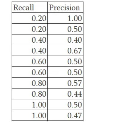 Recall of 0.2 has the highest precision value of 1.00. Recall value of 0.4 has different precision values 0.4, 0.67, 0.5. In this scenario, we use the highest precision value of 0.67. When the precision value is 0.6, we have precision value of 0.5 but for a recall of 0.8, we see a higher precision value of 0.57. Based on the rationale for 11 point interpolation, we take the maximum of all future points, so the precision that we need consider is 0.57 instead of 0.5. Finally for a recall of 1.0, we take the max precision which is 0.5.