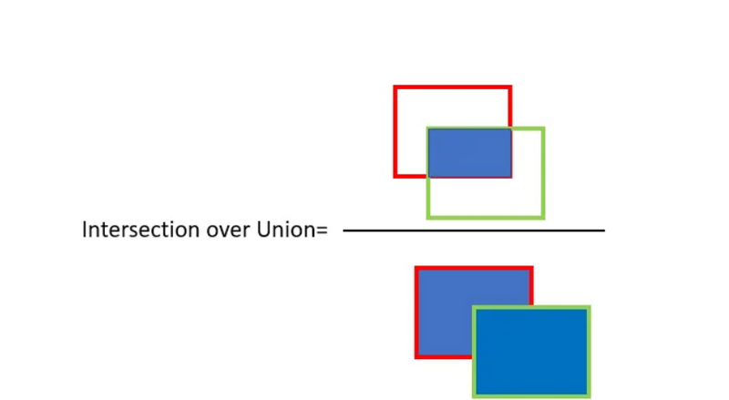 For object detection we use the concept of Intersection over Union (IoU). IoU computes intersection over the union of the two bounding boxes; the bounding box for the ground truth and the predicted bounding box