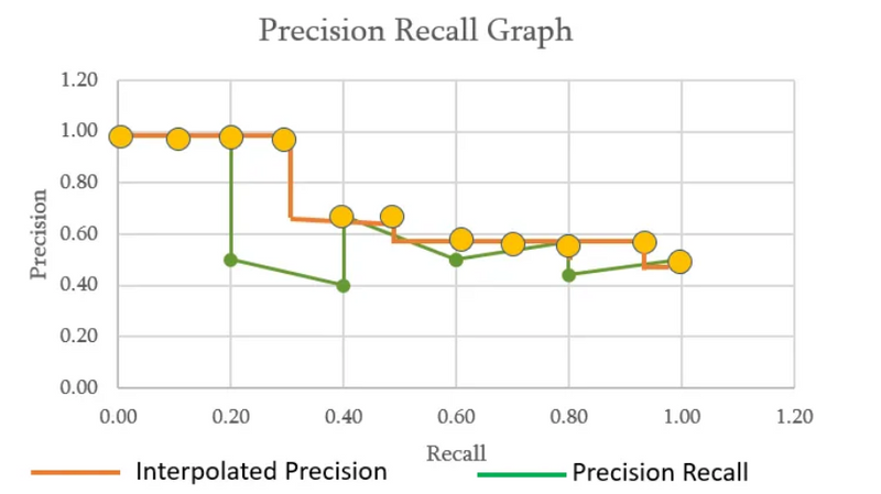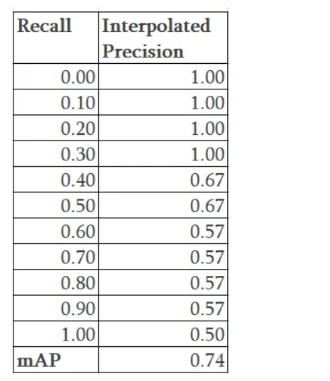 Interpolated precision is average precision measured at 11 equally spaced recall levels of 0.0, 0.1, 0.2, 0.3 ….0.9, 1.0 as shown in the figure above
