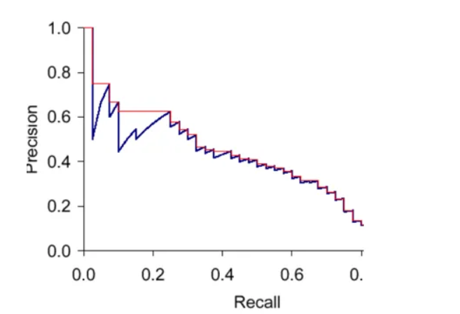 The PR graph sometimes may not be monotonically decreasing, to resolve the issue, we set max of precision for a value of recall. Graphically, at each recall level, we replace each precision value with the maximum precision value to the right of that recall level i.e.; we take the maximum of all future points