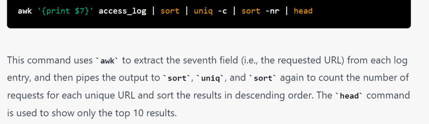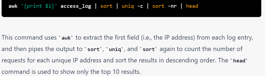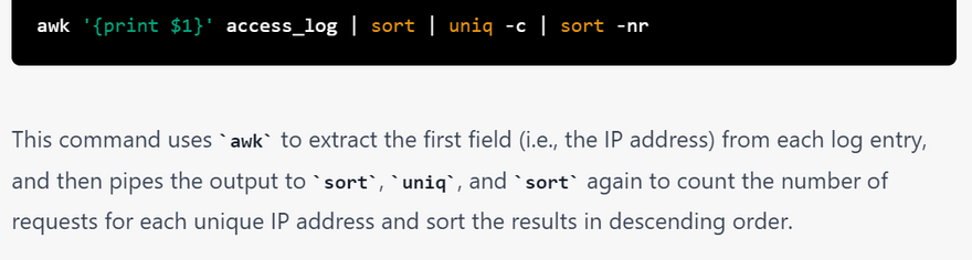 You can use various Linux commands and pipes to examine the access_log file generated by a web server. Here are some examples: