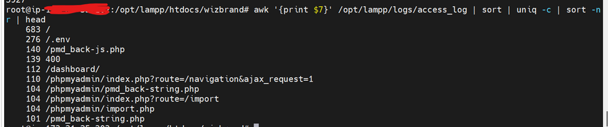 awk '{print $7}' access_log | sort | uniq -c | sort -nr | head