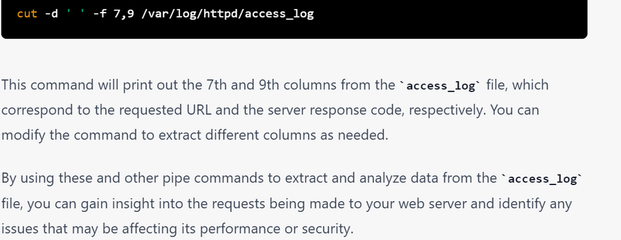 The cut command can be used to extract specific columns from the access_log file. For example, to extract the URL and response code columns from the access_log file, you can use the following command: