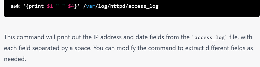 The awk command can be used to extract specific fields from the access_log file. For example, to extract the IP address and date fields from the access_log file, you can use the following command: