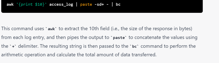 This command uses awk to extract the 10th field (i.e., the size of the response in bytes) from each log entry, and then pipes the output to paste to concatenate the values using the + delimiter. The resulting string is then passed to the bc command to perform the arithmetic operation and calculate the total amount of data transferred.