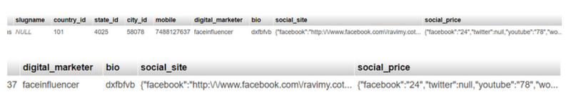 {"id":157,"user_id":"28","user_name":"admins","user_email":"admins@gmail.com","file_pic":"","slug_id":null,"slug":"admins","slugname":null,"country_id":"101","state_id":"4025","city_id":"58078","mobile":"7488127637","digital_marketer":"faceinfluencer","bio":"dxfbfvb","social_price":"{\"facebook\":\"24\",\"twitter\":null,\"youtube\":\"78\",\"wordpress\":\"88\","instagram\":\"78\",\"quora\":\"55\",\"pinterest\":null,"roposo\":null,\"chingari\":null,\"mitron\":null}"}