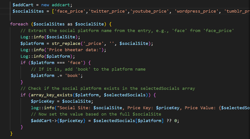 log::info("Social Site: $socialSite, Price Key: $priceKey, Price Value: {$selectedSocials[$platform]}");