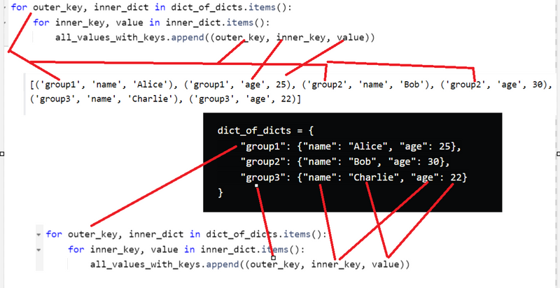 how to grouping key and key of inner dictionary,value of inner dictionary of outer dictionary