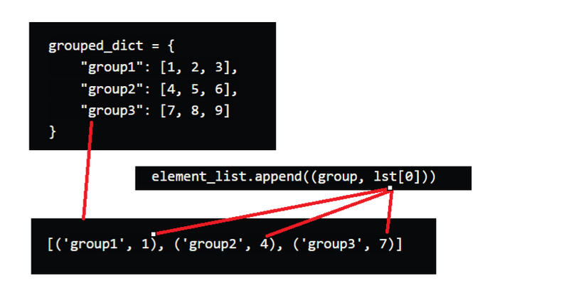 element_list = [(group, lst[0]) for group, lst in grouped_dict.items()]