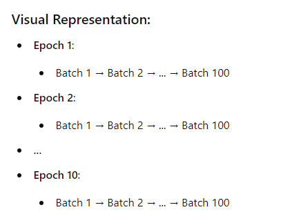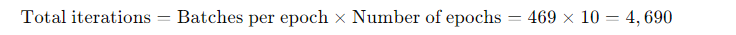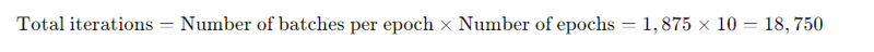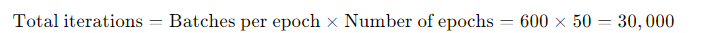 Total Number of Iterations: The total number of iterations (or steps) for the entire training process is calculated by multiplying the number of batches per epoch by the number of epochs: