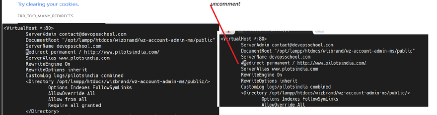 rakesh kumar Posted on Oct 14, 2022 How To Fix Too Many Redirects looping continously Problem: solution just uncomment rediret permanent in virtual host Top comments (0) Subscribe Personal Trusted User Create template Templates let you quickly answer FAQs or store snippets for re-use. Submit Preview Dismiss Code of Conduct • Report abuse Are you sure you want to hide this comment? It will become hidden in your post, but will still be visible via the comment's permalink. Hide child comments as well Confirm For further actions, you may consider blocking this person and/or reporting abuse