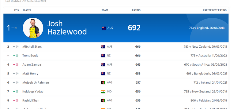 Top 10 ODI teams in men’s cricket along with the records for matches, points and rating