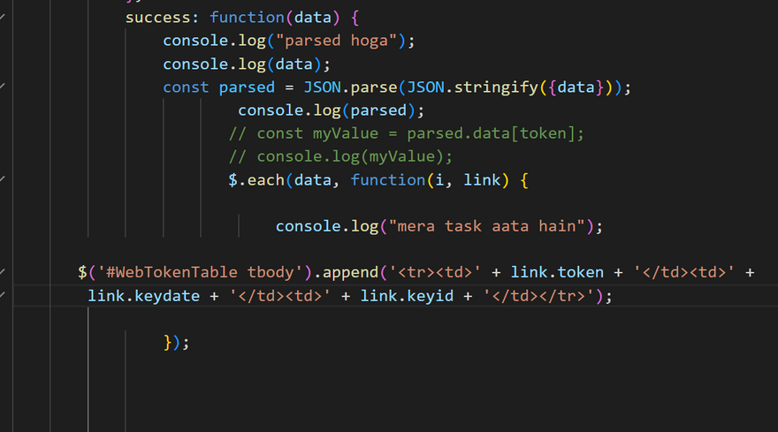 $('#WebTokenTable tbody').append('<tr><td>' + link.token + '</td><td>' + link.keydate + '</td><td>' + link.keyid + '</td></tr>');