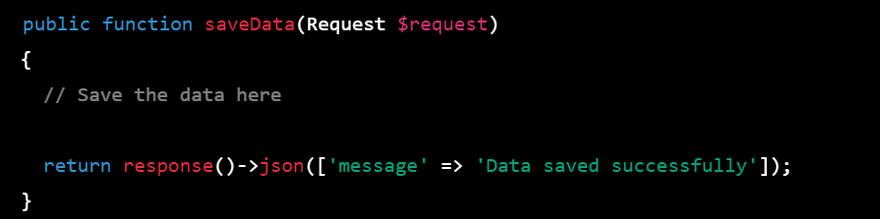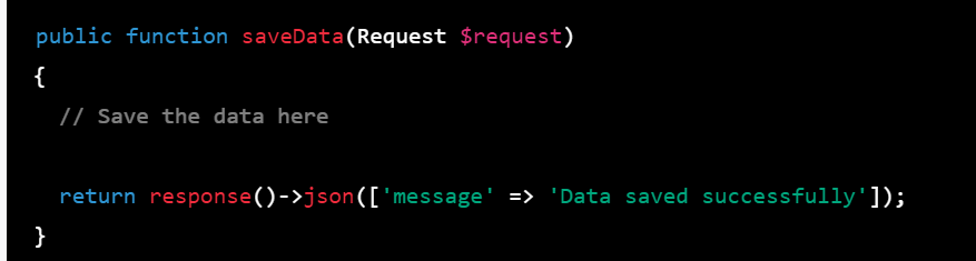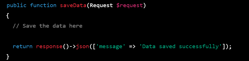 Step 4: In your Laravel controller method that handles the request, you can return a JSON response with a message indicating whether the data was saved successfully or not. For example: