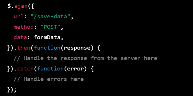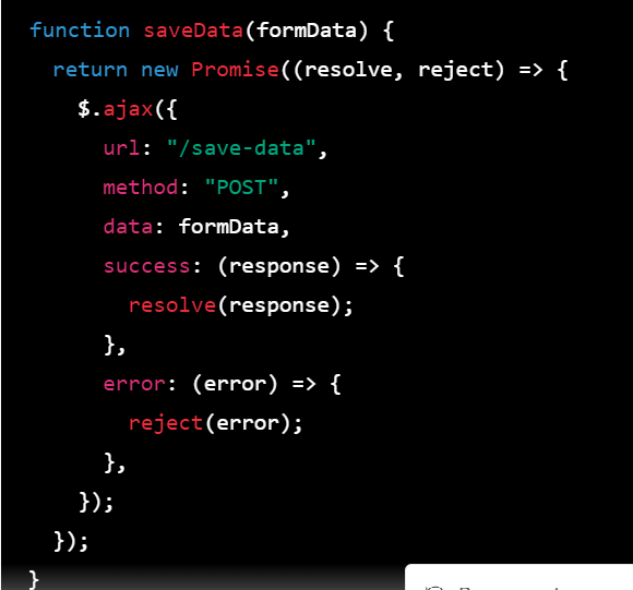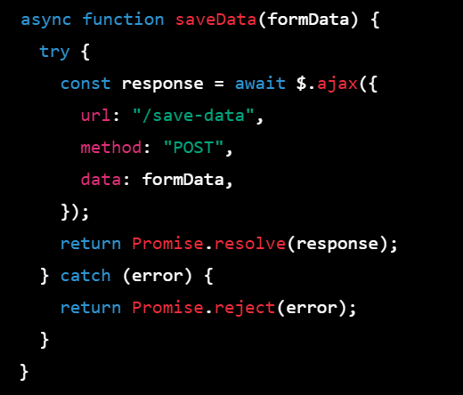 Step 2: In your jQuery code, use the async keyword to define an asynchronous function that sends a request to the server to save the data. Inside this function, use the await keyword to wait for the response from the server. If the response is successful, return the response data wrapped in a resolved promise. If there is an error, throw an error wrapped in a rejected promise.