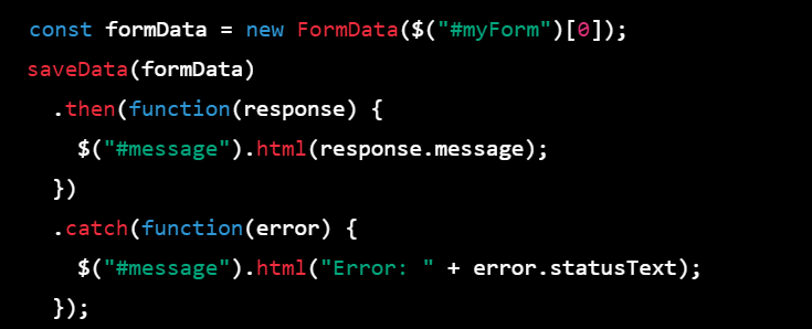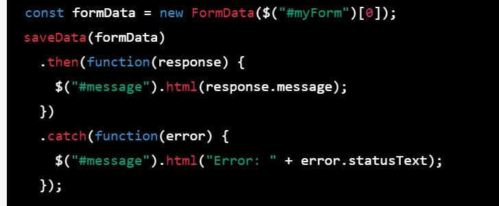 Step 3: Call the saveData function and use the then method to handle the response from the server. If the server returns a success message, display it in the message element using the html method of jQuery. If there is an error, display the error message in the message element.