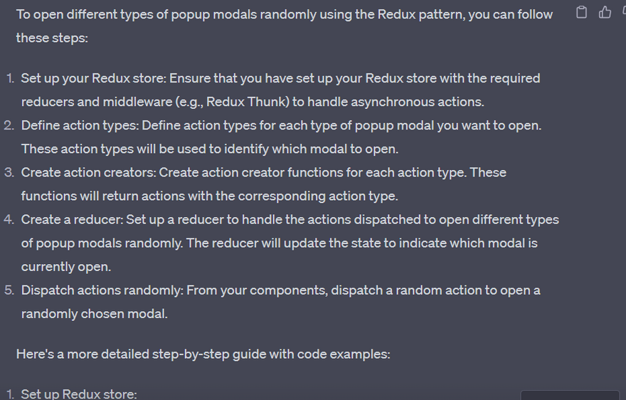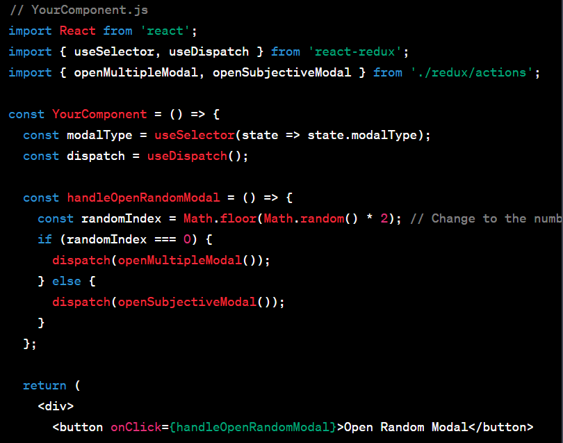 In this example, we set up a Redux store with a modalReducer that handles actions to open different types of modals randomly. The YourComponent component connects to the store using useSelector to access the modalType state and useDispatch to dispatch random actions to open random modals. The handleOpenRandomModal function generates a random index and dispatches a random action based on that index. Depending on the modalType, the component conditionally renders the content of the corresponding modal.