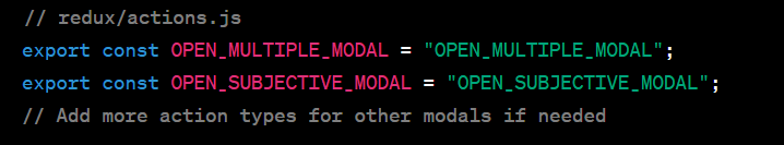 Define action types: Define action types for each type of popup modal you want to open. These action types will be used to identify which modal to open.