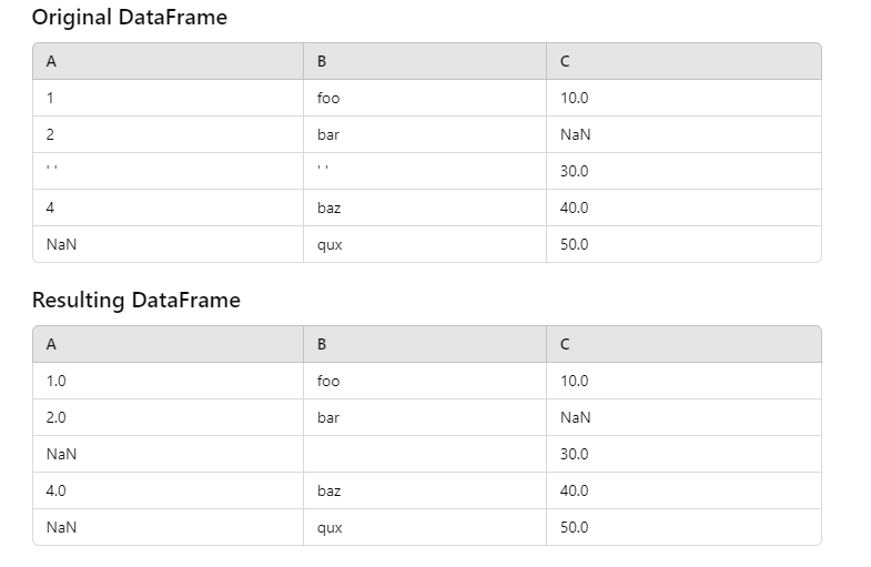 'A': [1, 2, ' ', 4, np.nan],