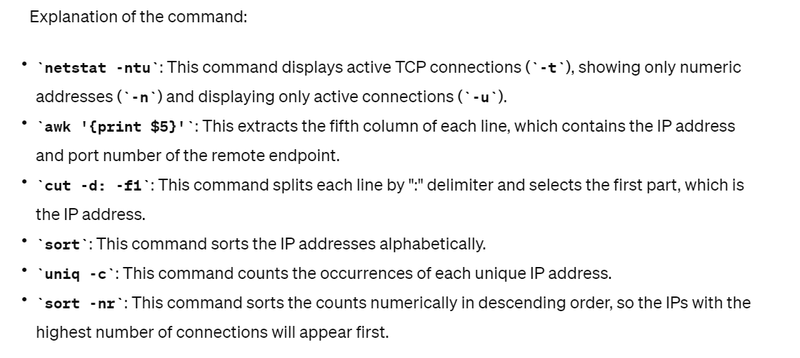 By running this command, you'll get a list of IP addresses along with the number of connections each IP has established with your server. This will help you identify any IPs with a high number of connections, which may indicate suspicious activity. Further investigation may be required to determine the nature of these connections and whether they pose a security threat.