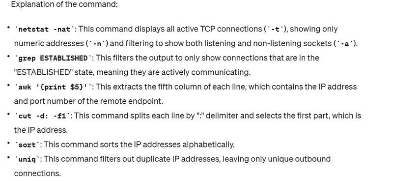 By running this command, you'll get a list of unique IP addresses to which outbound connections are established from your server. Reviewing these connections can help identify any unexpected outbound connections, which may be indicative of malicious activity. Further investigation into the purpose and legitimacy of these connections may be necessary to mitigate any potential security risks.