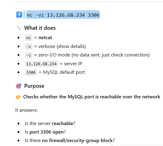 Checks whether the MySQL port (3306) is reachable from your serve