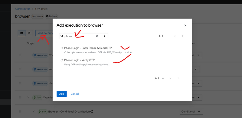 ✅ Click Add execution → select Phone Login - Enter Phone & Send OTP → set REQUIRED