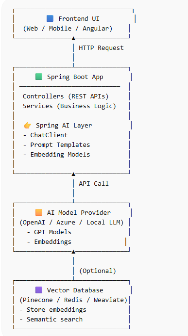 - AI Integration Layer Connects your Spring Boot app with AI models Handles API calls, authentication, retries