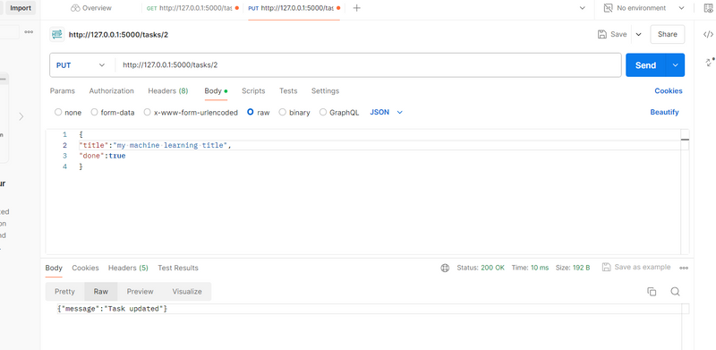 Purpose: This route allows you to update an existing task by its id. The task’s title and done status can be modified.