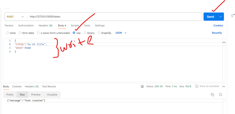 Purpose: This route allows you to create a new task by sending a POST request with a JSON payload containing the title and done status of the task.