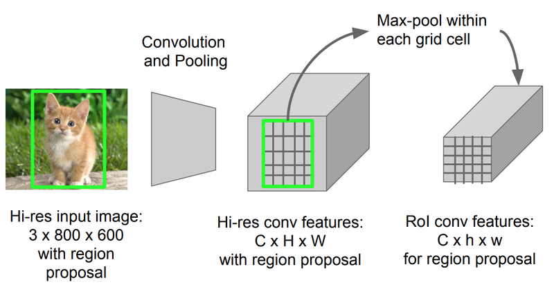 [Image] ---> [CNN] ---> [Feature Maps] ---> [RoI Pooling] ---> [Fixed-size Feature Vector] ---> [Classification and Regression Heads]