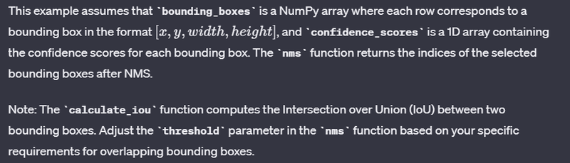 In this example, calculate_iou computes the IoU between two bounding boxes, and the nms function performs the NMS algorithm. Adjust the threshold parameter in the nms function based on your specific requirements for overlapping bounding boxes.
