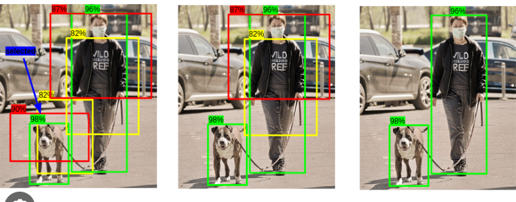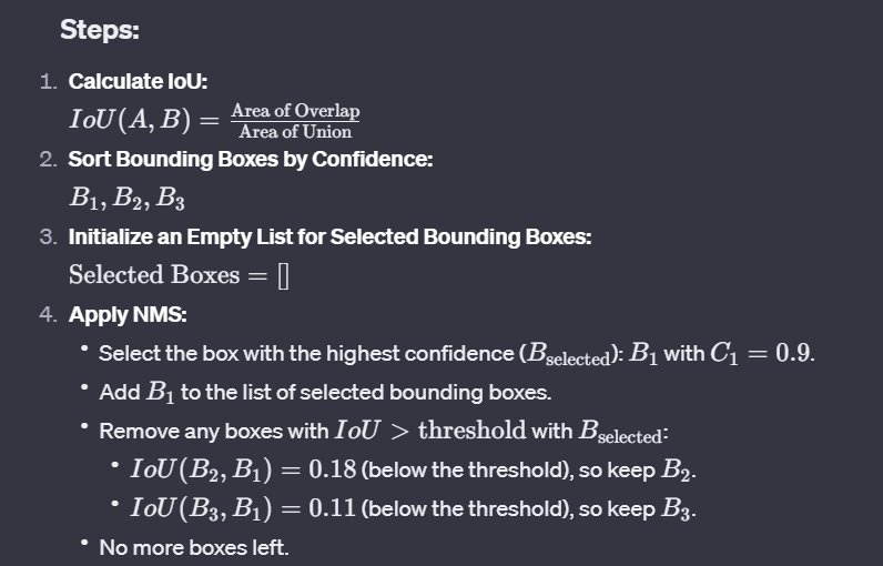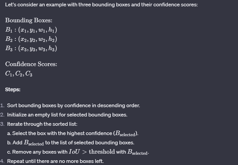 Non-Maximum Suppression (NMS) is a common technique used to remove overlapping bounding boxes in object detection. The goal of NMS is to retain the most confident bounding box predictions while eliminating redundant and highly overlapped ones. Here's a step-by-step guide on how to perform NMS with examples: