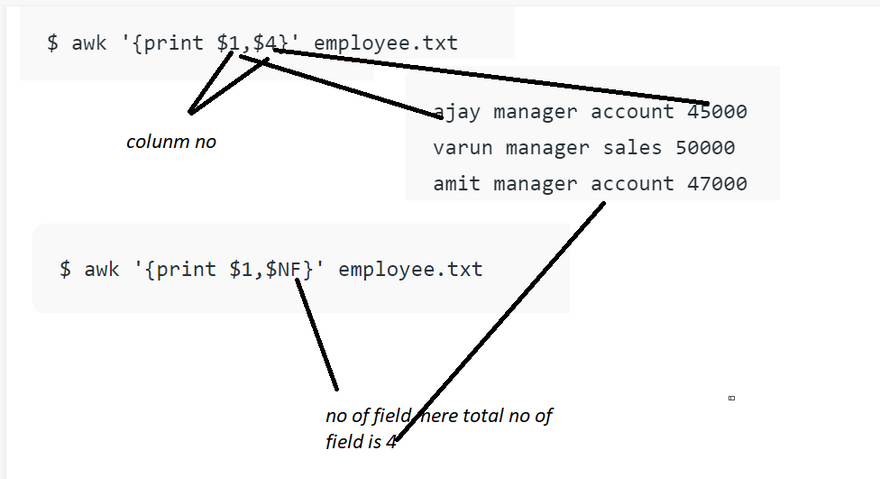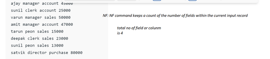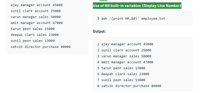 - User Defined Functions 4.How to prints every line of data from the specified file. ? 5.How to prints Name and Salary fields from the specified file(two methods)’. . 6.How to prints every line of data from the specified file. 7.What are the Built-In Variables In Awk. 8.How to prints all the lines along with the line number. 9.How to prints the line number 3 to 6.