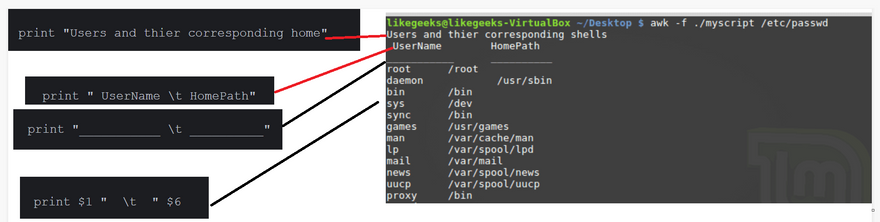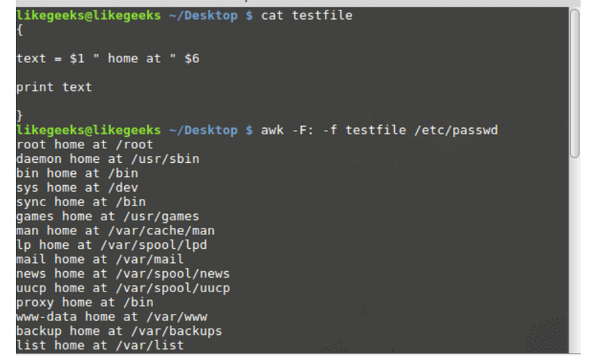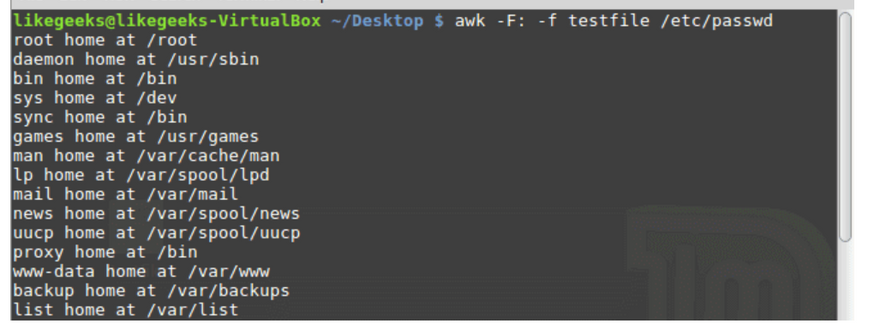 Here we print the username and his home path from /etc/passwd, and surely the separator is specified with capital -F which is the colon.