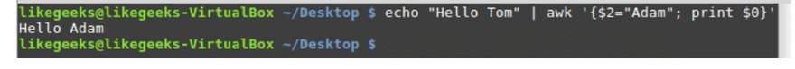 $ echo "Hello Tom" | awk '{$2="Adam"; print $0}'