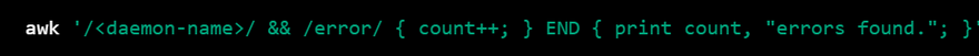 awk '/<daemon-name>/ && /error/ { count++; } END { print count, "errors found."; }' /var/log/<log-file>