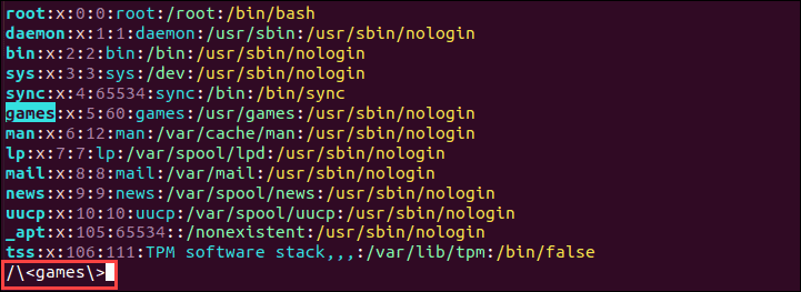 For example, to open the /etc/passwd file where it first uses the term "root", use the command: