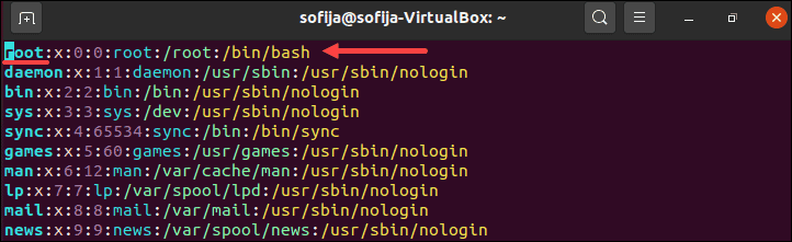 The text editor opens the file and the first line it displays is the one containing the term "root", as in the image below.