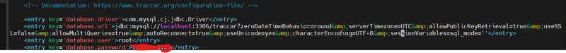<entry key='database.url'>jdbc:mysql://localhost:3306/traccar?zeroDateTimeBehavior=round&serverTimezone=UTC&allowPublicKeyRetrieval=true&useSSL=false&allowMultiQueries=true&autoReconnect=true&useUnicode=yes&characterEncoding=UTF-8&sessionVariables=sql_mode=''</entry>