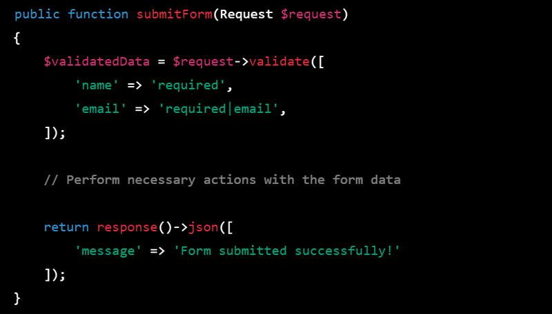 In this code, we are using Laravel's built-in validation to ensure that the name and email fields are not empty and that the email field contains a valid email address. We then perform any necessary actions with the form data, such as saving it to a database. Finally, we return a JSON response with a success message.