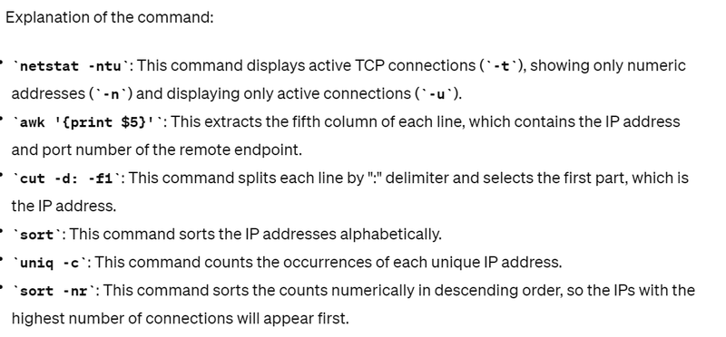 grep -E -v "(^Active|^Proto|^tcp6|^udp6|^tcp|^udp|^unix|^Proto)": This command filters out unwanted lines. -E enables extended regular expressions, and -v inverts the match so that it shows lines that do not match the pattern. The pattern matches lines that start with "Active", "Proto", "tcp6", "udp6", "tcp", "udp", "unix", or "Proto", effectively filtering out the headers and IPv6 entries.