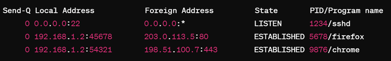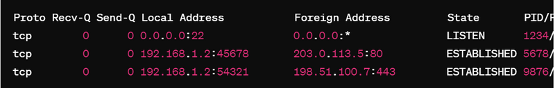 tcp 0 0 192.168.1.2:54321 198.51.100.7:443 ESTABLISHED 9876/chrome