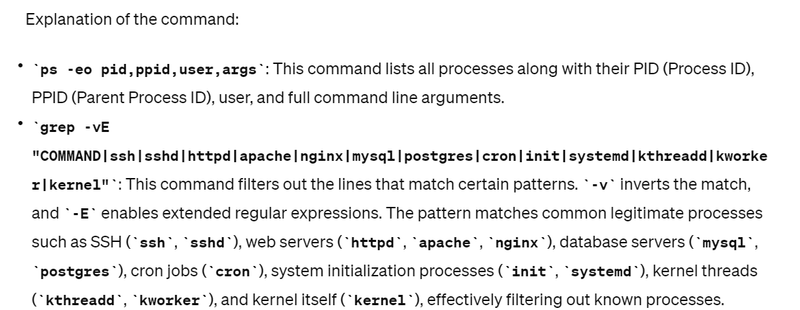 This command will give you a list of processes that are not commonly associated with standard system services. Processes with obscure names or mimicking legitimate processes may indicate suspicious or unauthorized activity. However, be cautious as some legitimate processes may have unusual names. Further investigation may be required before taking any action.