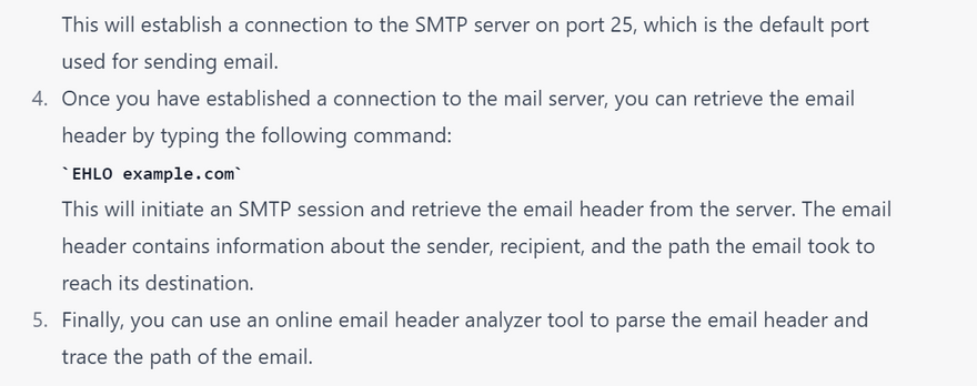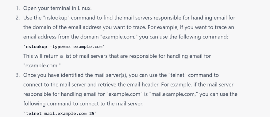 3.Once you have identified the mail server(s), you can use the "telnet" command to connect to the mail server and retrieve the email header. For example, if the mail server responsible for handling email for "example.com" is "mail.example.com," you can use the following command to connect to the mail server: